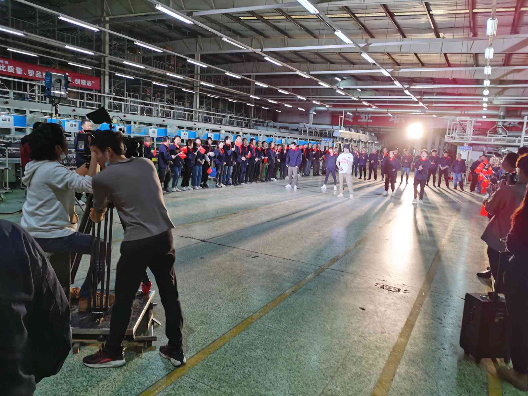 《贊歌獻給黨》MV攝制組走進前鋒集團西區(qū)產(chǎn)業(yè)園,拍攝在這里拉開序幕。“跑得再整齊一點”“大家的表情再舒展一些”……身著工作服的近20位青年,手舉旗幟,闊步奔跑——這是拍攝中的一個場景。本次拍攝共有三個室內(nèi)場景,一個室外場景,參與的職工有近百名,為了呈現(xiàn)出最好的畫面效果,參與人員反復溝通、調(diào)整,有不少鏡頭至少拍了六七次。