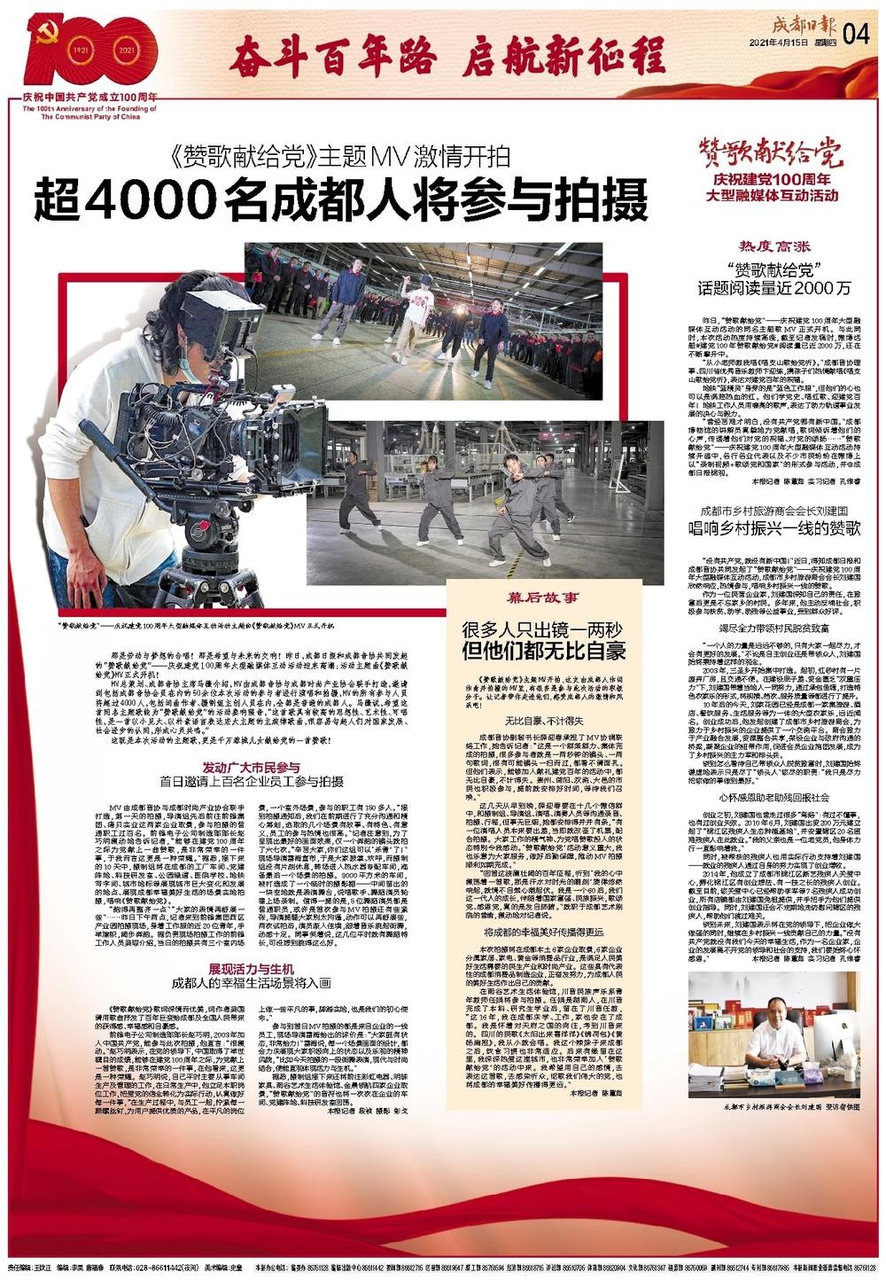 那是勞動與夢想的合唱!那是希望與未來的交響!在春回大地的時節(jié),成都日報和成都市音協(xié)共同發(fā)起的“贊歌獻給黨”——慶祝建黨100周年大型融媒體互動活動也迎來高潮:活動主題曲《贊歌獻給黨》MV在前鋒集團西區(qū)產(chǎn)業(yè)園開機!充滿朝氣、朗朗上口的旋律,將從這一刻開始在城市的上空回蕩。