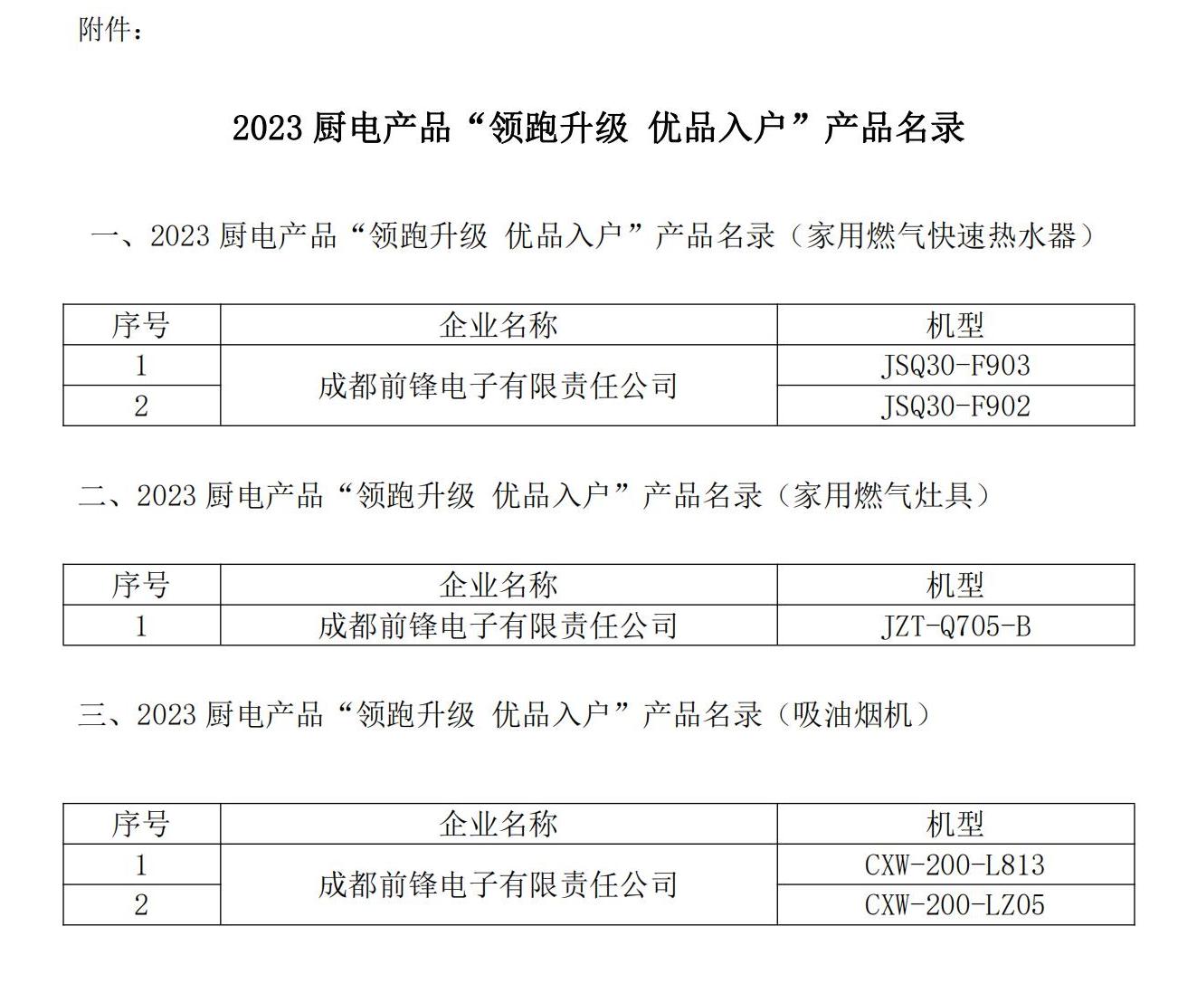 前鋒廚電入選“領(lǐng)跑升級 優(yōu)品入戶”產(chǎn)品名錄